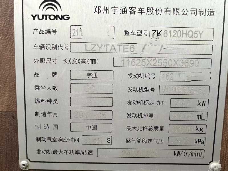 | 客车品牌 | 宇通客车 | 上牌时间 | 2021-06-23 |