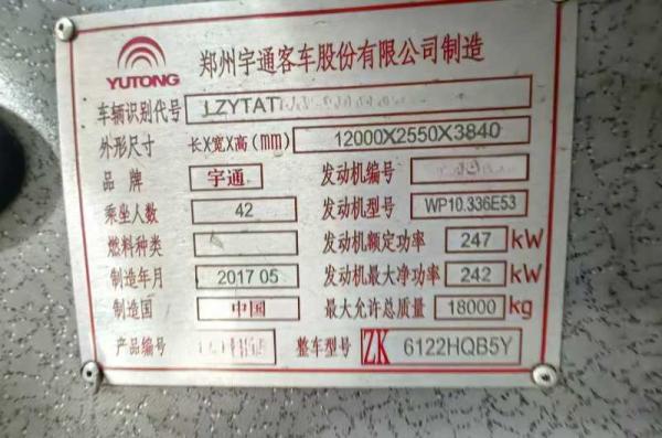 | 客车品牌 | 宇通客车 | 上牌时间 | 2017-05-23 |