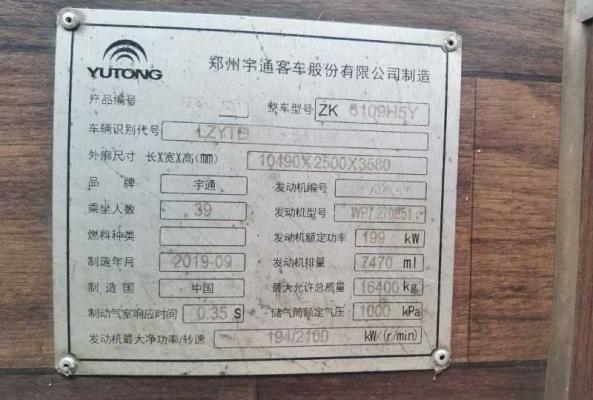 | 客车品牌 | 宇通客车 | 上牌时间 | 2019-12-20 |