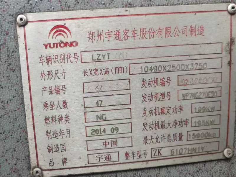 来台47座天然气LNG宇通6107营运车,2014年11月上牌,潍柴270国五发动机,有中门,行李架,公路客运性质,有兴趣的来聊