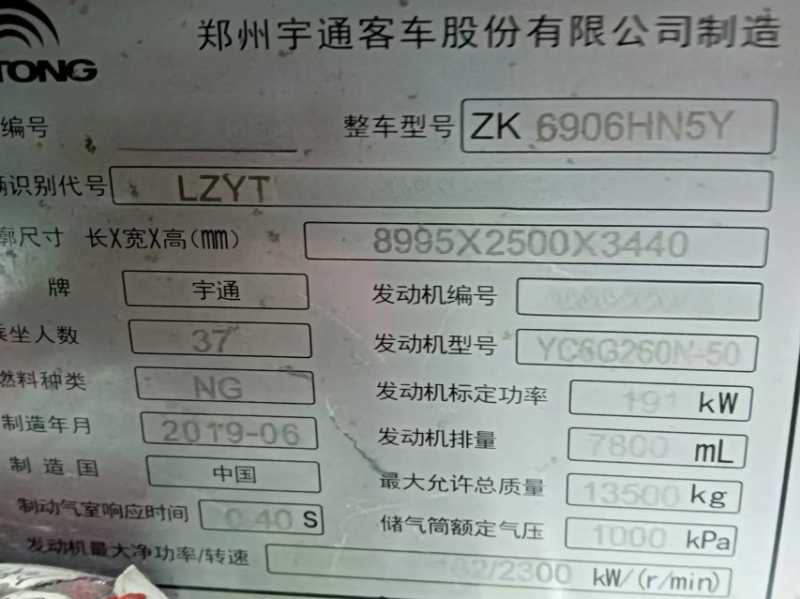 | 客车品牌 | 宇通客车 | 上牌时间 | 2019-06-08 |