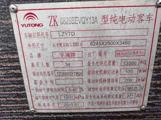 2019年上牌一批34座宁德时代宇通6826营运版电车