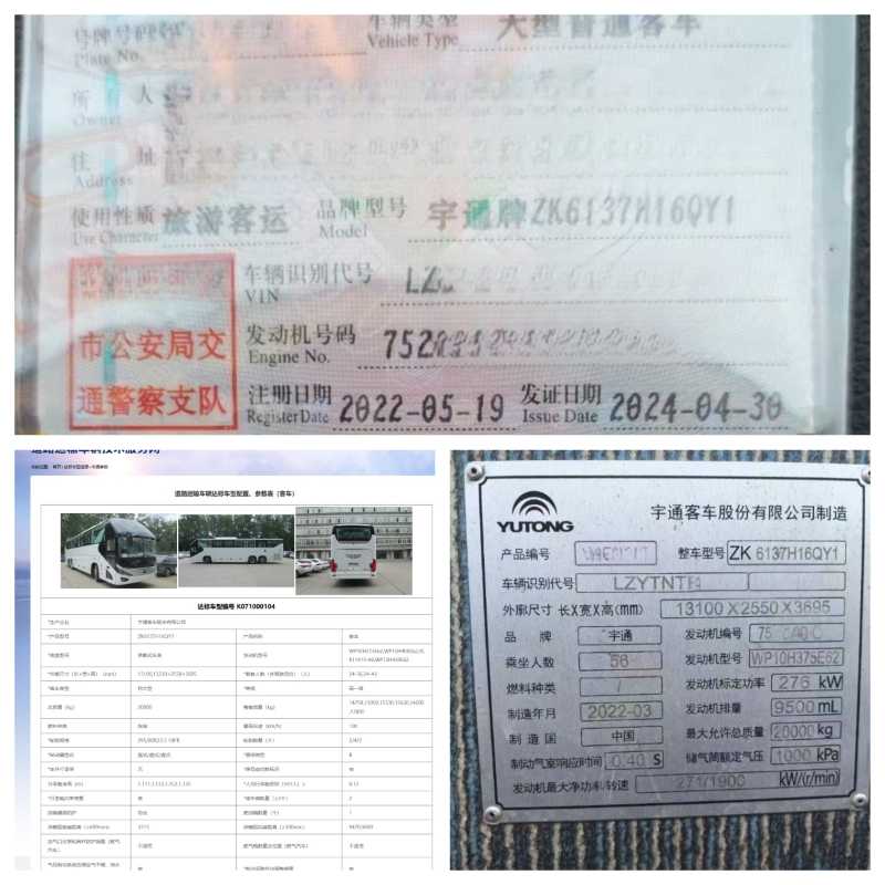 2022年5月上牌国六有公告56座宇通6137气囊旅游车