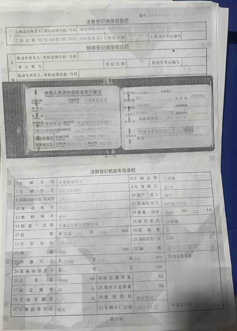 | 客车品牌 | 宇通客车 | 上牌时间 | 2022-05-17 |