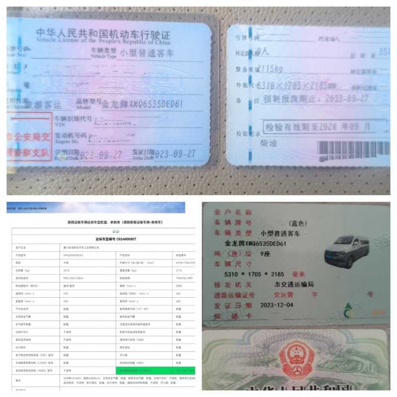 来台有公告国六柴油版9座蓝牌车 2023年9月上牌金龙6535,C照可开,潍柴120发动机,2.3排量,皮质座椅,木纹地板,旅游客运性质,可提营运,喜欢的来 本公司接受客车置换(国三国四国五,非营运,旅游客运,公路客运,公交客运都可以)。我们有着丰富的外迁内地城市经验。也可做正规出口手续。我们在广东省珠三角区域(深圳、广州、珠海、佛山、东莞、惠州)从事二手车数十年,全部是薄利多销的价格出售,不管是单台还是批量•均享受最诚信的合作态度。也可以根据您需要的指定车型来优选匹配,柴油.油电混合、新能源纯电动均可在珠三角区域看到现车,各种品牌都有,油车,新能源电车,油电混合,天然气客车等,可安排师傅代驾送车,或者物流配送发往全国。我们的宗旨:不但销售的车型丰富多元化,服务更是全方位:可视频看车定车,可代驾送车。另外本公司常年收购2座-55座客车,中巴、大巴都可以操作。 公司地址:1、深圳市南山区西丽街道曙光社区云家供应链有限公司宿舍101车友汇鑫汽车贸易有限公司 2、深圳罗湖区宝岗路1号淘车吧