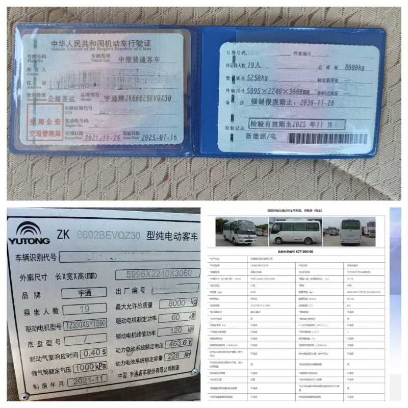 多台有公告19座宇通6602新能源电车 2021年11月上牌,中型客车,5.99米,B照可开,106度电,宁德时代电池,朩纹地板,外摆门,小型中级营运公告,公路客运性质,可提营运,喜欢的来: 本公司接受客车置换(国三国四国五,非营运,旅游客运,公路客运,公交客运都可以)。我们有着丰富的外迁内地城市经验。也可做正规出口手续。我们在广东省珠三角区域(深圳、广州、珠海、佛山、东莞、惠州)从事二手车数十年,全部是薄利多销的价格出售,不管是单台还是批量•均享受最诚信的合作态度。也可以根据您需要的指定车型来优选匹配,柴油.油电混合、新能源纯电动均可在珠三角区域看到现车,各种品牌都有,油车,新能源电车,油电混合,天然气客车等,可安排师傅代驾送车,或者物流配送发往全国。我们的宗旨:不但销售的车型丰富多元化,服务更是全方位:可视频看车定车,可代驾送车。另外本公司常年收购2座-55座客车,中巴、大巴都可以操作。 公司地址:1、深圳市南山区西丽街道曙光社区云家供应链有限公司宿舍101车友汇鑫汽车贸易有限公司 2、深圳罗湖区宝岗路1号淘车吧