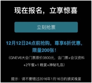 甩卖说的是为了回应众多关注新能源汽车大会的真爱粉(这理由官方的我都想抱自己大腿),12月10日-12月12日,原价3800的大会门票限时6折优惠200张。呵呵哒,你抢到了幸运的200分之1吗?