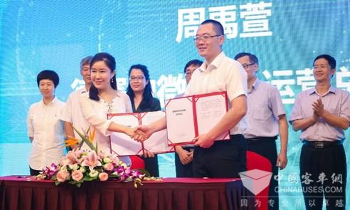 中国电动汽车百人会双创中心主任周禹萱(左)与纳微创谷运营总监张成龙(右)现场签约