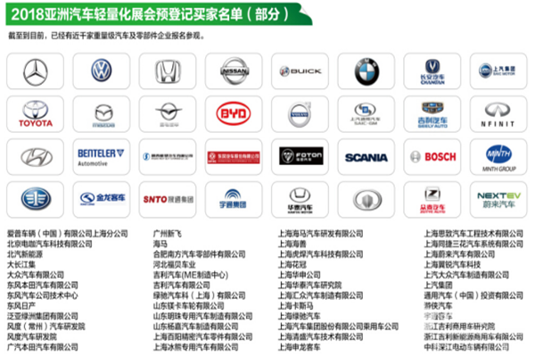 据了解,展会将汇集上千家知名品牌供应商,包括宝钢、中铝、忠旺、Novelis、韩国浦项、马钢、福建海源、鲁西、和氏璧化工、内蒙古瑜利轻合金装备、康得复合材料、北京中材汽车复合材料等龙头企业。截至到目前,已有近千家专业买家报名参观,包括大众、一汽、上汽、广汽、吉利、比亚迪、中集、博世、宇通、金龙客车、东风、福田等中外知名主机厂,他们将带着行业最新采购需求莅临展会交流及采购。