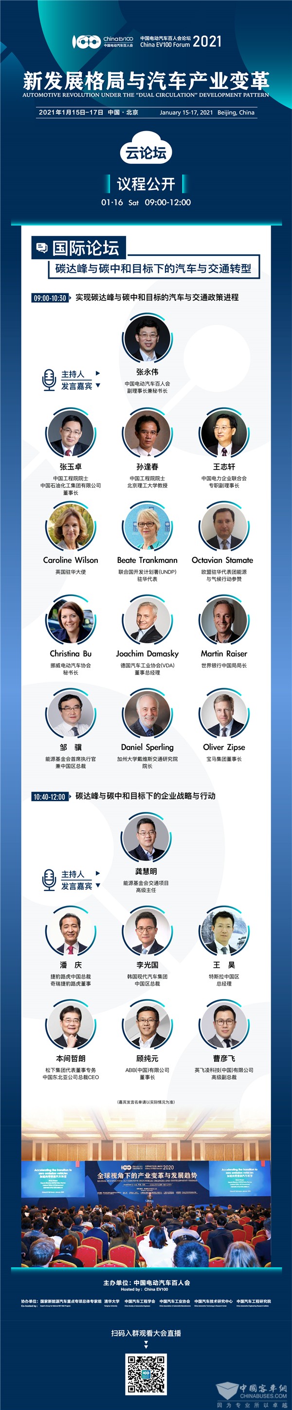 中国电动汽车百人会论坛(2021)将于1月15-17日举办,大会主题聚焦“新发展格局与汽车产业变革”,3天会议期间共设置2场高层论坛以及7场主题论坛。根据北京市及钓鱼台国宾馆防疫要求,不允许举办100人以上的集会活动。本届大会取消线下参会报名,取消现场听会观众,百人会欢迎各界嘉宾采取观看视频直播的方式远程参会。