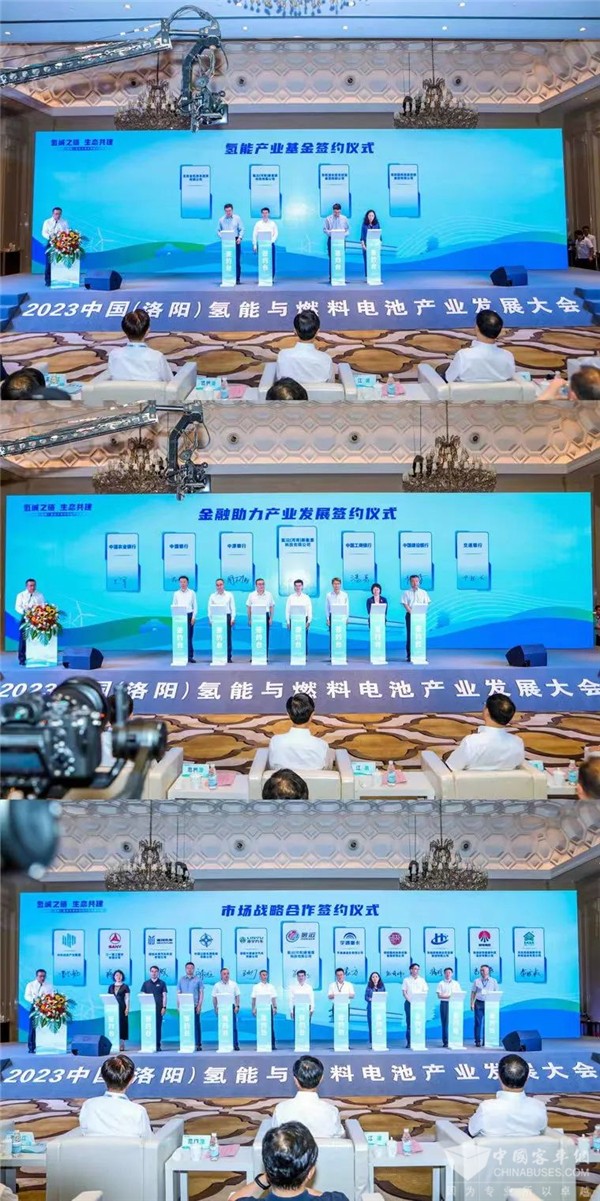 在金融助力产业发展签约仪式环节,中原银行、中国工商银行河南分行、中国银行洛阳分行、中国建设银行洛阳分行、中国农业银行洛阳分行、交通银行洛阳分行共同与氢沄新能源进行签约。