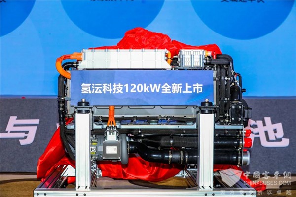现场发布的120kw燃料电池发动机系统,通过开发高耐久膜电极和长寿命控制策略,实现商用车30万公里(性能衰减10%作为寿命终止标准),设计寿命30000小时,降低发动机故障率80%。通过精细化设计与能量管理相结合,实现系统最高效率≥58%,系统以高度集成轻量化设计,体积功率密度达到800w/L。