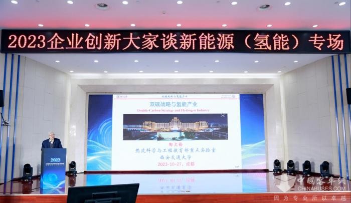 中国科学院院士、西安交通大学能源与动力工程学院教授陶文铨以《双碳战略与氢能产业》为题,围绕我国双碳战略,介绍了氢能产业的发展现状和方向;中国科学院院士、南京大学物理学院教授邹志刚以《国家双碳目标下的氢能源发展——机遇与挑战》为题,分析了国家双碳目标下的氢能产业的机遇与挑战;东方电气(成都)氢燃料电池科技有限公司党委副书记、总经理黄果以《东方电气氢能产业布局及实践》为题,从企业发展的角度,介绍了东方电气在氢能领域的布局和实践。