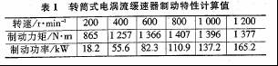 将转筒式电涡流缓速器的设计参数代入计算公式,计算结果见表1。从表1可见,缓速器的制动力矩随着转速增加而增加,达到最大制动力矩后随着转速的增加而下降;而制动功率随着转速的增加而增加。