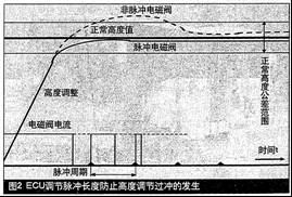 ECAS ECU采用脉冲方式控制电磁阀的开启,根据当前实际高度与预期调节高度的偏差,ECU计算电磁阀的调节脉冲长度,如果需要调节的高度量大、由于没有过冲的危险ECU将给出一个长的脉冲,同时,快的上升速度将减小脉冲长度,这样就能精确控制车辆的高度调节速度,极大的避免了高度的过冲及振荡调节。如图2所示。