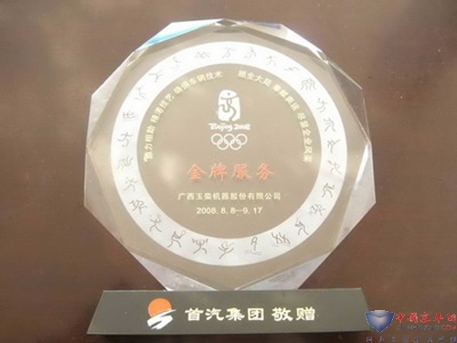 “专业铸就品牌,服务创造价值”,北京奥运期间,玉柴派出的北京奥运专项服务保障小组圆满地完成了任务,赢得了首汽集团的高度评价,近日被首汽集团授予“金牌服务”荣誉称号。