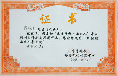 新时期山东形象大使证书
