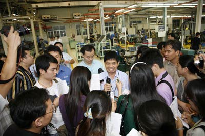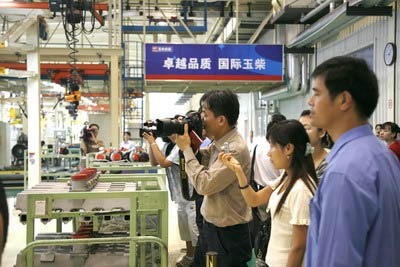 此次新闻采访团的规模大,接待级别也较高。2日早上,所有的参观接待车几乎全部出动,新闻采访团浩浩荡荡进入厂区,开始探索这个中国最大的内燃机生产基地。在参观途中,记者们纷纷探窗观看,大片规划合理的厂房和整洁的厂区大道向记者们展示了一个大企业的风范,保安严密的疏导让车队畅通无阻。在参观试验中心这个“国家认可试验室”时,一些记者窃窃私语:“这可比我们上次去的某个试验室好多了,先进多了。”当记者们进入发动机一厂重机装试车间时,那跃眼而入的绿道黄线,一派忙碌的景象,马上吸引他们打开镜头盖,“咔嚓咔嚓”个不停,有些还边拍边赞叹“很干净、很有序的现代化生产车间。”