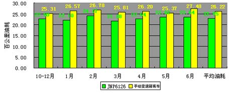 绿色数据表示7辆装有AS-Tronic变速箱的JNP6126客车的平均百公里油耗。黄色数据表示9辆装有手动变速箱的客车的平均百公里油耗。我们可以看到装有AS-Tronic变速箱的车队平均百公里油耗为22.95L;而另一个装有手动箱的车队平均百公里油耗为26.22L。