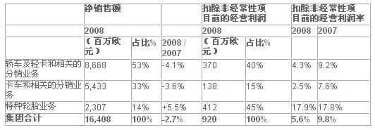 - 轿车及轻卡轮胎的销量在2008年显著减少,体现了整体市场趋势及分销商减少库存的放大效应。不过,米其林品牌依然保持活力,在所有地区市场中都加强了其地位。