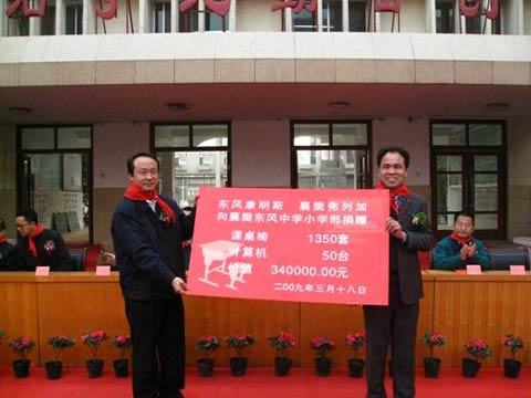 3 月 18 日 ,东风康明斯、襄樊弗列加联合向襄樊基地东风小学进行捐赠活动,东风康明斯总经理刘晓星,东风康明斯工会主席何永辉,襄樊弗列加工会主席、质量部部长王光顺等出席了捐赠仪式。