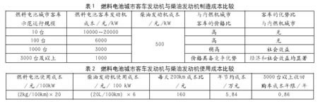 燃料电池客车发动机与柴油发动机制造成本和使用成本的比较如表1、表2所示。