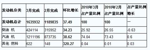 根据中国汽车工业协会的统计,2010年3月份生产汽车173.43万辆,比2月增长43.79%;销售汽车 173.52万辆,比2月增长43.22%;3月份共生产发动机163.59万台,比2月增长37.49%;销售发动机163.11万台,比2月增长 34.86%。