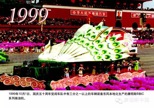 1999年正值中国五十周年大庆。康明斯环保天然气发动机做为改善大气质量的关键举措之一,正式配装北京公交车辆并投入运营。此外,国庆五十周年受阅车辆中,有三分之一以上的车辆装备了东风本地化生产的康明斯B系和C系柴油发动机。