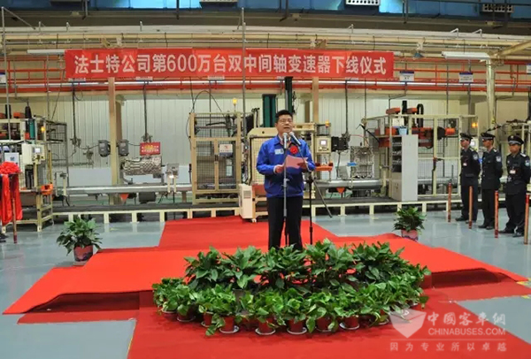 严鉴铂董事长希望广大员工:要正确认识新常态和供给侧改革带来的困难和挑战,要聚焦新常态、发力新常态、突破新常态、引领新常态,努力将新常态转化为企业创新发展新动能。要以第600万台变速器下线为契机,以企业“5221”战略为指引,始终坚持专业化、智能化、高端化、多元化和国际化为发展方向不动摇,充分发挥企业科技创新优势、装备制造优势、产业布局优势和文化引领优势,加速研发新产品、培育新引擎、拓展新市场、跟进新业态、打造新亮点,加速推动产业优化升级。要以“两化推进年”活动为抓手,加速智能化、信息化在研发、制造、销售等各领域的推广应用步伐,重点在创新驱动、提质增效、转型升级、降低内耗等方面做文章;重点在新能源、新产品、新工艺、新业态等方面下功夫,着力打造法士特制造升级版,加速推动企业迈向中高端。要进一步增强紧迫感、危机感和使命感,牢固树立热爱企业、心存感恩、主动作为、勇于担当的责任意识,充分发扬“团结、务实、顽强、开拓”的企业精神,大力弘扬精益求精、一丝不苟、追求卓越的工匠精神,认真践行不畏挑战、任劳任怨、勇于奉献的先模精神,以更加昂扬的斗志、更加饱满的激情和更加务实的作风,为践行企业战略目标和创建更加美好的幸福生活而努力奋斗。