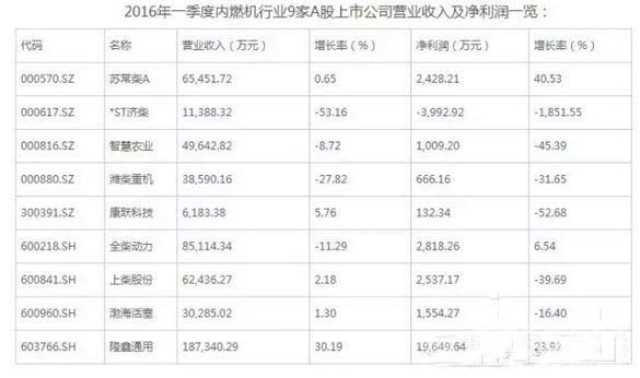 一季度内燃机行业上市公司营业收入及净利润排名