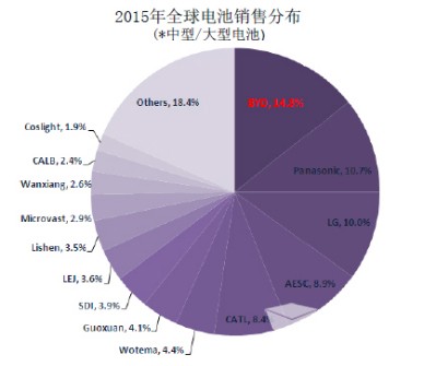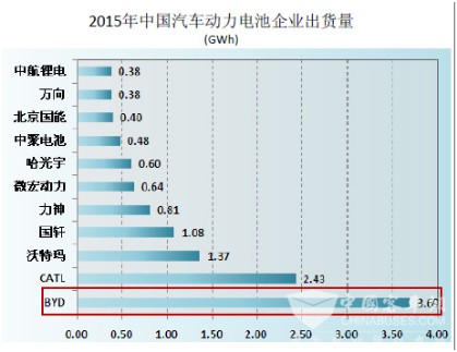 根据第三方统计数据,比亚迪2015年在全球动力电池领域的出货量达到3.69GWH,市场份额占到了14%。