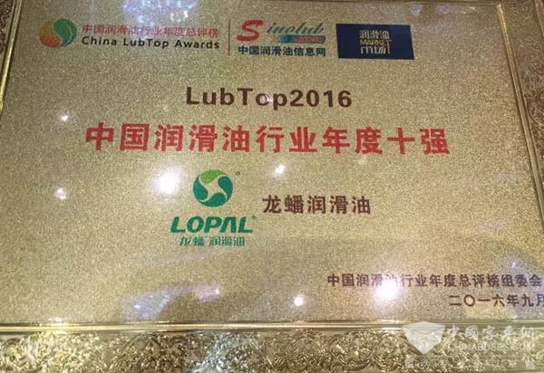 龙蟠科技获"LubTop2016中国润滑油行业十强"称号
