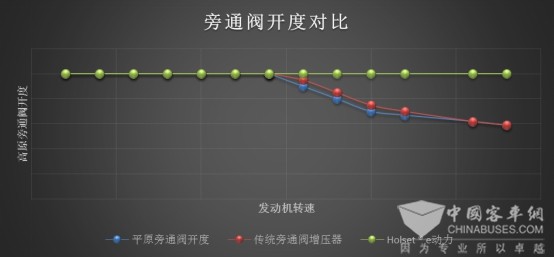 相比传统的旁通阀增压器,Holset® e动力将旁通阀开启方式从被动的气体推动,改为主动电控调节控制。在接收到ECU传递过来的电信号后,驱动连杆机构推动旁通阀的开启,主动控制增压器涡轮的做功能力,实现进气量在一定范围内自由调节,满足发动机不同转速和扭矩对进气量的需求。下图充分显示,Holset® e动力主动控制旁通阀开度,高原应用中控制旁通阀全关,有效的提高发动机的进气量。