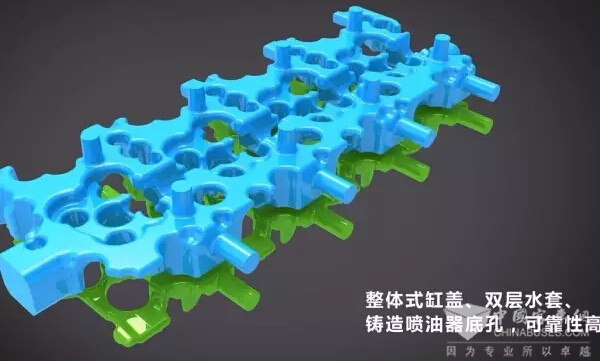 塑料缸盖罩、油气分离器预分离、主分离集成在气缸盖罩总成;机油滤清、机油冷却、单向阀、机油节温器、水泵集成在机油滤清器模块;机油泵内外转子、主油道限压阀、发动机前端盖集成在油泵模块。