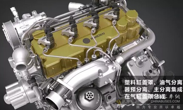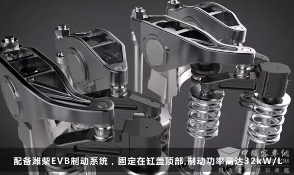 配备潍柴EVB制动系统,固定在缸盖顶部,制动功率高达32kW/L。