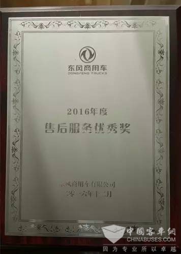 可兰素荣获东风商用车2016年度“售后服务优秀奖”