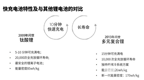 这里是我们两代的电池产品,2009年就推了第一代LpTO钛酸锂电池,5-10分钟可以充满电,它的寿命是非常优秀的,两万次的充放寿命,但它的缺点是能量密度低一些,刚才大家也都提到这个事情了,不过瑕不掩瑜,它应用的范围还是非常广的。右边这一个是我们2013年问世的LpCO锂电池,它在保留原来钛酸锂快充长寿命的优异性能上又做了一些升级,就是能量密度大幅度提升了。而我们将推出的第三代快充电池,能量密度达到了170瓦时每公斤。