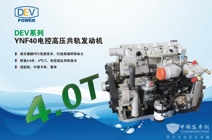 2016年1月初,YNF40柴油机批量生产顺利下线。作为一款中高端、可覆盖现有4105、4108、4110产品功率段的四气门国四、国五柴油机,YNF40主要匹配市场上7~10米的中巴及6~15吨中重型卡车,最大功率125KW,最大扭矩600N·m,并具有升级国六排放水平的潜能。