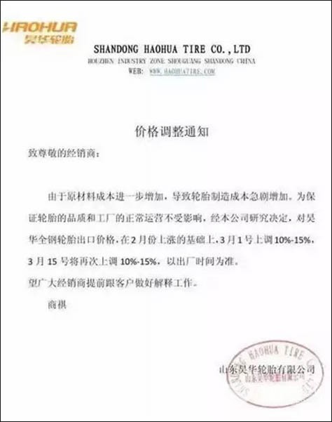 近日,昊华全钢轮胎调整产品出口价格,在2月份上涨的基础上,3月1日上调10%-15%,3月15日再上调10%-15%,以出厂时间为准。
