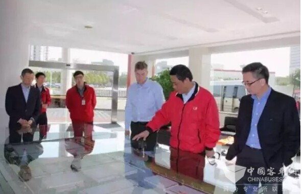 东风康明斯总经理熊振洪向冯天祥一行介绍公司布局图