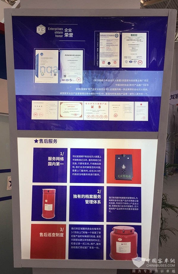 目前,世纪星产品仅在客车行业的安装率就超过了80%,很多客车制造厂已将其作为车辆的标准配置。在经历了成都公交大火之后,交通运输管理部门将遏制车辆火灾,避免群死群伤作为对各级领导的考核指标。为此,公交集团、长途客运公司纷纷发文要求所有运营车辆必须安装该产品,并将其作为安全检查的一项必备灭火设备。