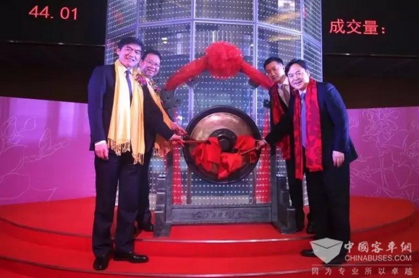 龙蟠科技董事长石俊峰(左二)与南京市人民政府副市长黄澜(左一)上台,共同为龙蟠科技A股股票交易鸣锣开市。本次龙蟠科技发行股票5200万股(股票简称为“龙蟠科技”,股票代码为603906),发行价格为9.52元/股,募资总额为4.95亿元。上市当天即以44.01%的涨幅封停在13.71元。