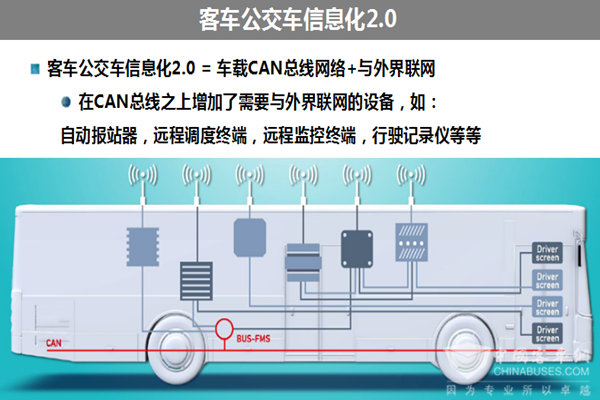“在客车公交车信息化1.0之前,客车公交车主要依靠传统强电控制方式,其缺点是负载越多线束越粗。”黄海平表示,进入客车公交车信息化1.0阶段后,可用总线控制系统控制车身、查看负载、车门等等的连接状态。这种方式实现了车辆信息的集成化控制管理,但系统却是封闭的,没有与外界有任何的互联互通,这也是1.0时代的技术弊端。