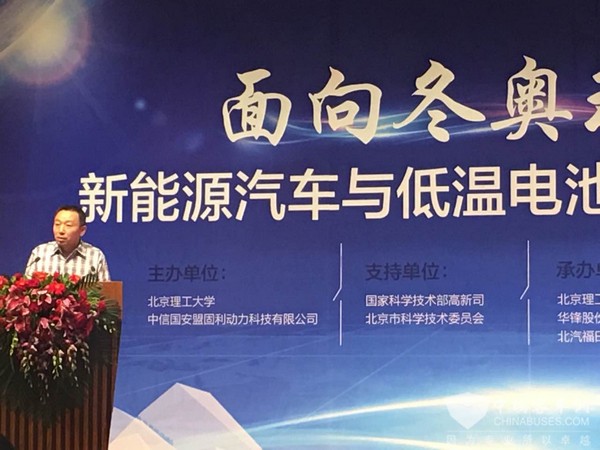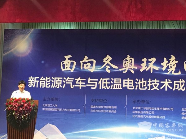 孙逢春教授此次“面向冬奥环境的新能源汽车与低温电池技术成果发布会”发布活动由北京理工大学、中信国安盟固利动力科技有限公司主办,北京理工华创电动车技术有限公司、北汽福田汽车股份有限公司、北京新能源汽车股份有限公司、郑州宇通客车股份有限公司等承办,国家科学技术部高新司和北京市科委作为支持单位派员出席。