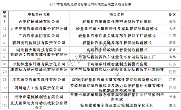 相比较而言,“2017年智能制造试点示范项目”更侧重生产方面的智能化,而“2017年智能制造综合标准化与新模式应用拟立项项目公示”更具象更明晰,尤其在汽车轻量化以及电机驱动系统的智能制造项目给予了较大的项目份额。