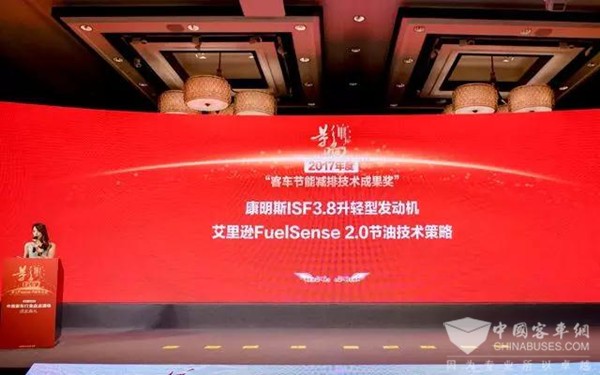 “2017年度客车节能减排技术成果奖”设立之缘由旨在筛选、表彰那些在客车节能减排方面有着突出技术贡献的客车配套产品和企业。为了保护大气环境、降低排放污染,康明斯始终积极与合作伙伴和用户共商减排增效大计。此次荣获2017年度客车节能减排技术成果奖的康明斯ISF系列3.8升轻型发动机,是面向未来的新一代超低排放、超高能效柴油机,功率范围覆盖107-168马力。这款发动机具有动力强劲、可靠耐久、结构紧凑、高效经济等特点,能够满足欧VI排放,且燃油经济性为业界翘楚。