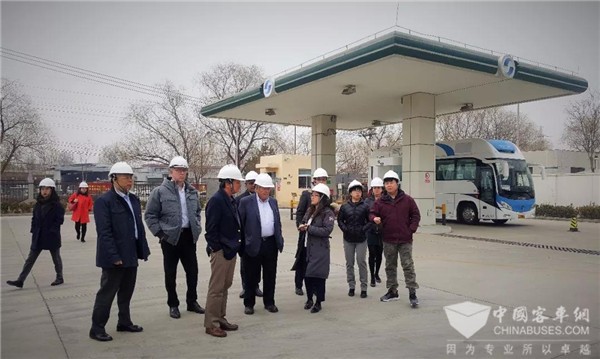 为了深度体验氢燃料电池汽车,康明斯调研团队专程租用了一台搭载亿华通氢燃料电池动力系统的商业化运营客车,为其排期非常紧凑的调研行程提供服务。在亿华通加氢站,调研团队详细了解了氢气的制备、储存、运输等细节。