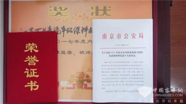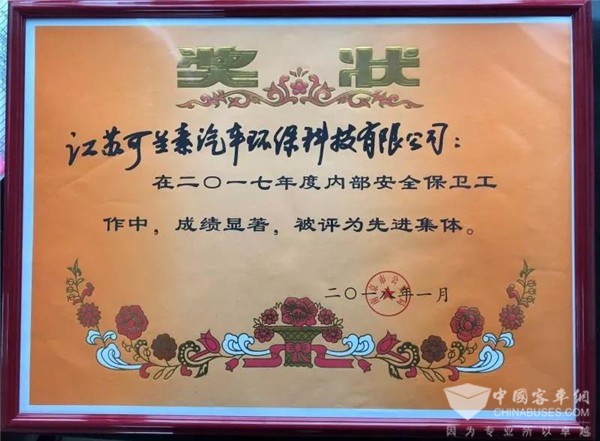 南京市公安局特授予江苏可兰素汽车环保科技有限公司为安全保卫工作“先进集体”