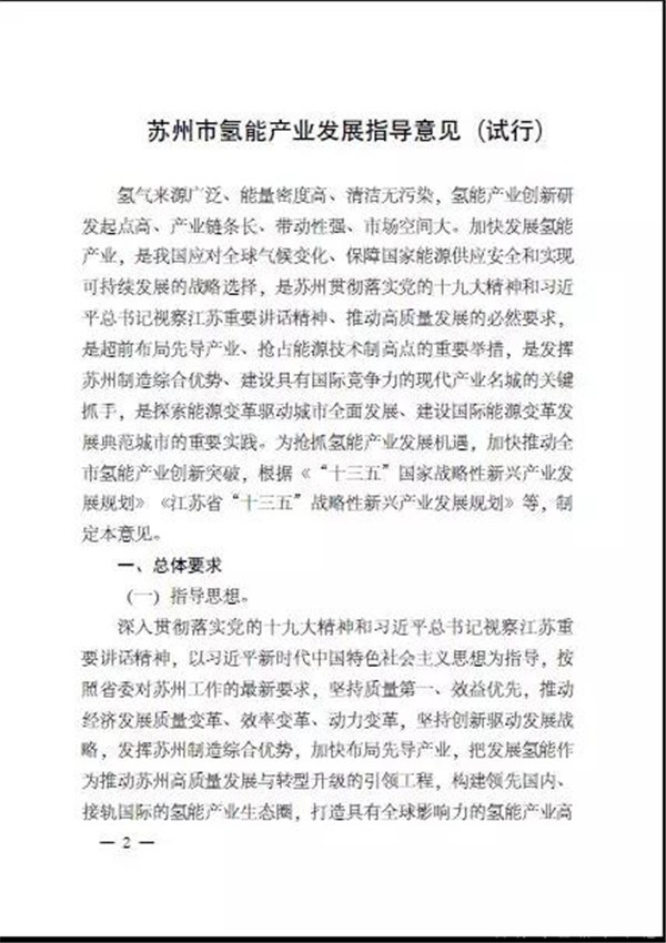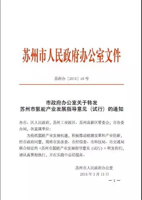 2018年3月20日电,XINGKONG.COM获悉,近日苏州市发改委网站公布了“市政府办公室关于转发苏州市氢能产业发展指导意见(试行)的通知”称,为了抢抓氢能产业发展机遇,积极推动能源变革和产业创新,经市政府同意,要求市、区各单位认真贯彻执行由市发改委、市经信委、市科技局、市交通局联合制定的《苏州市氢能产业发展指导意见(试行)》(见附件),并在实践中总结提高。