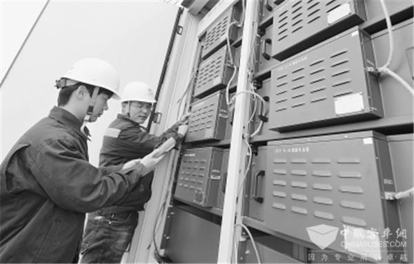 工作人员在做充电站投用前的设备检测
